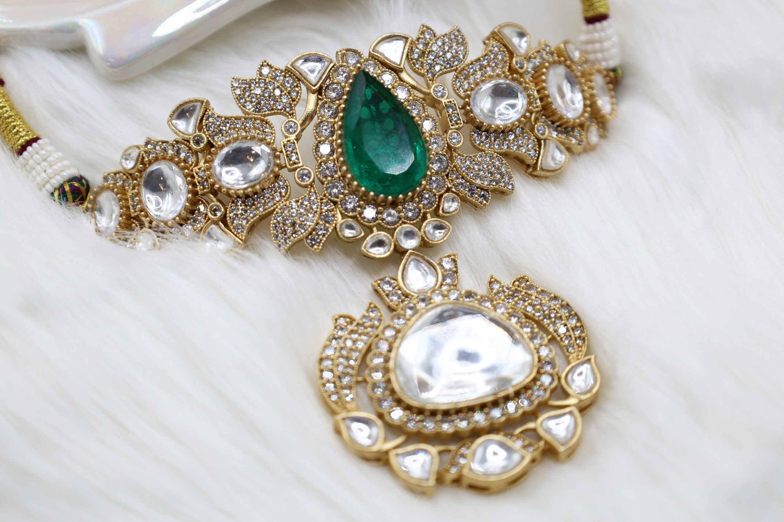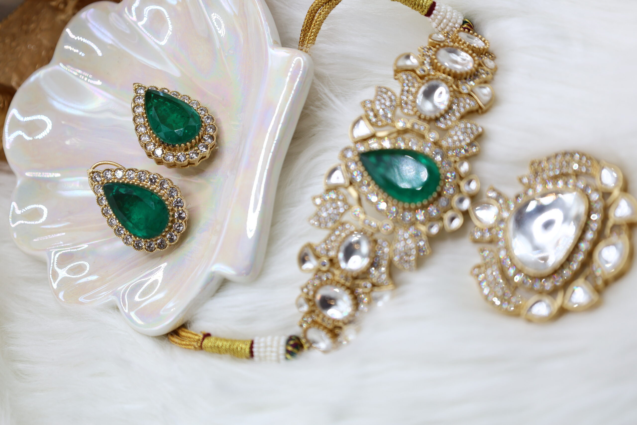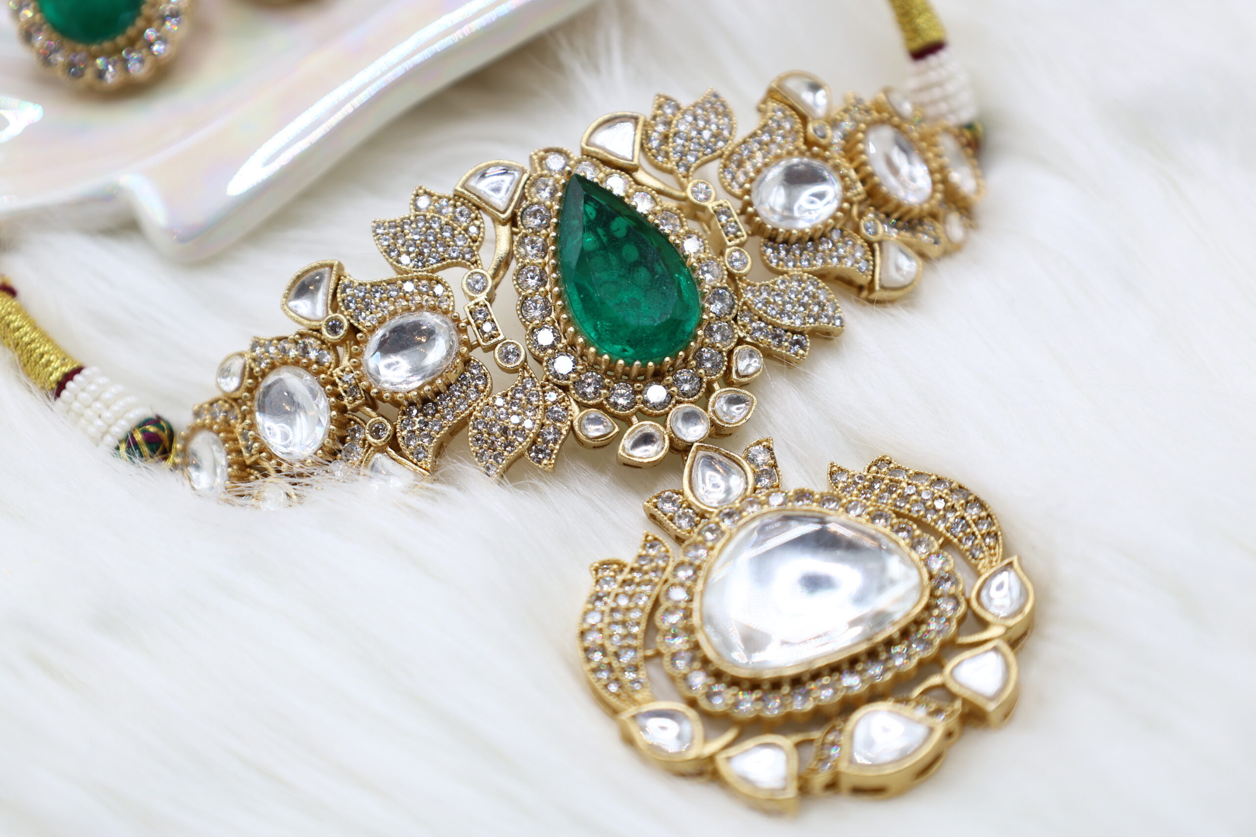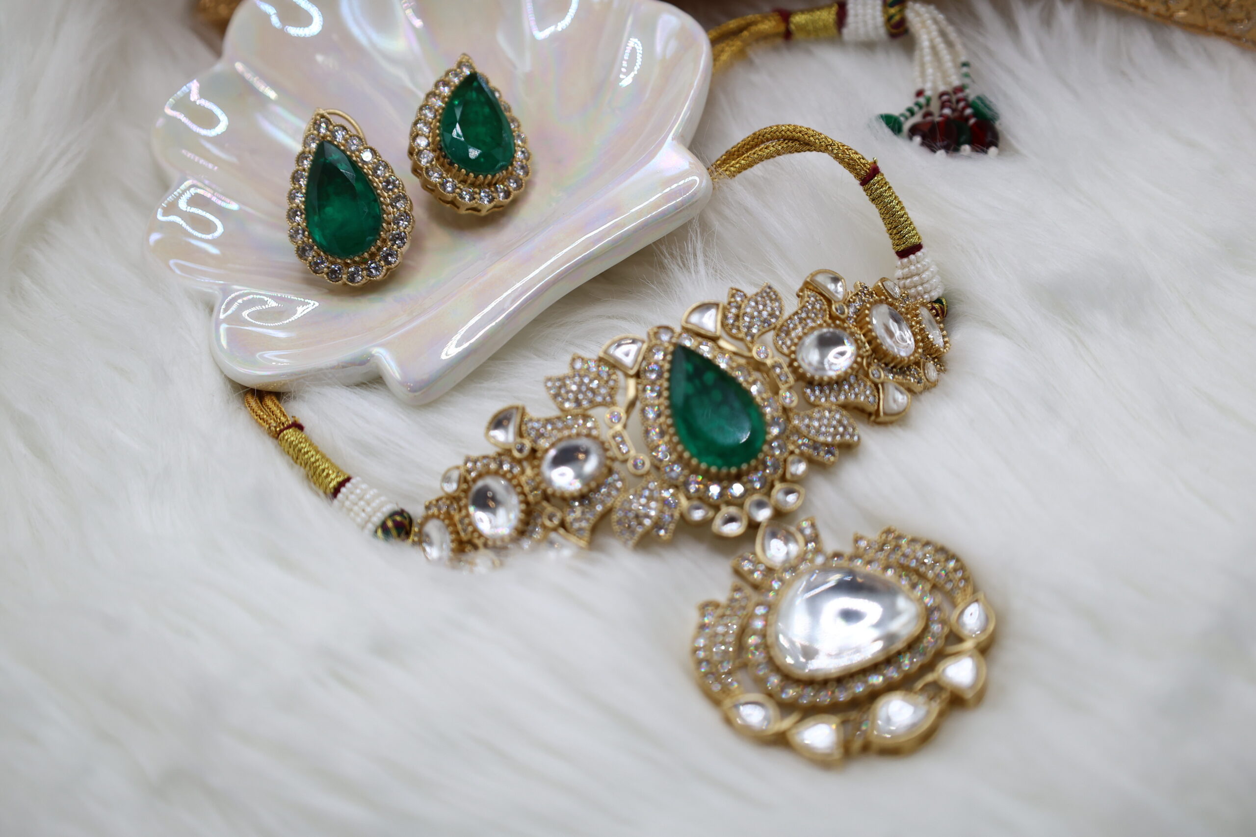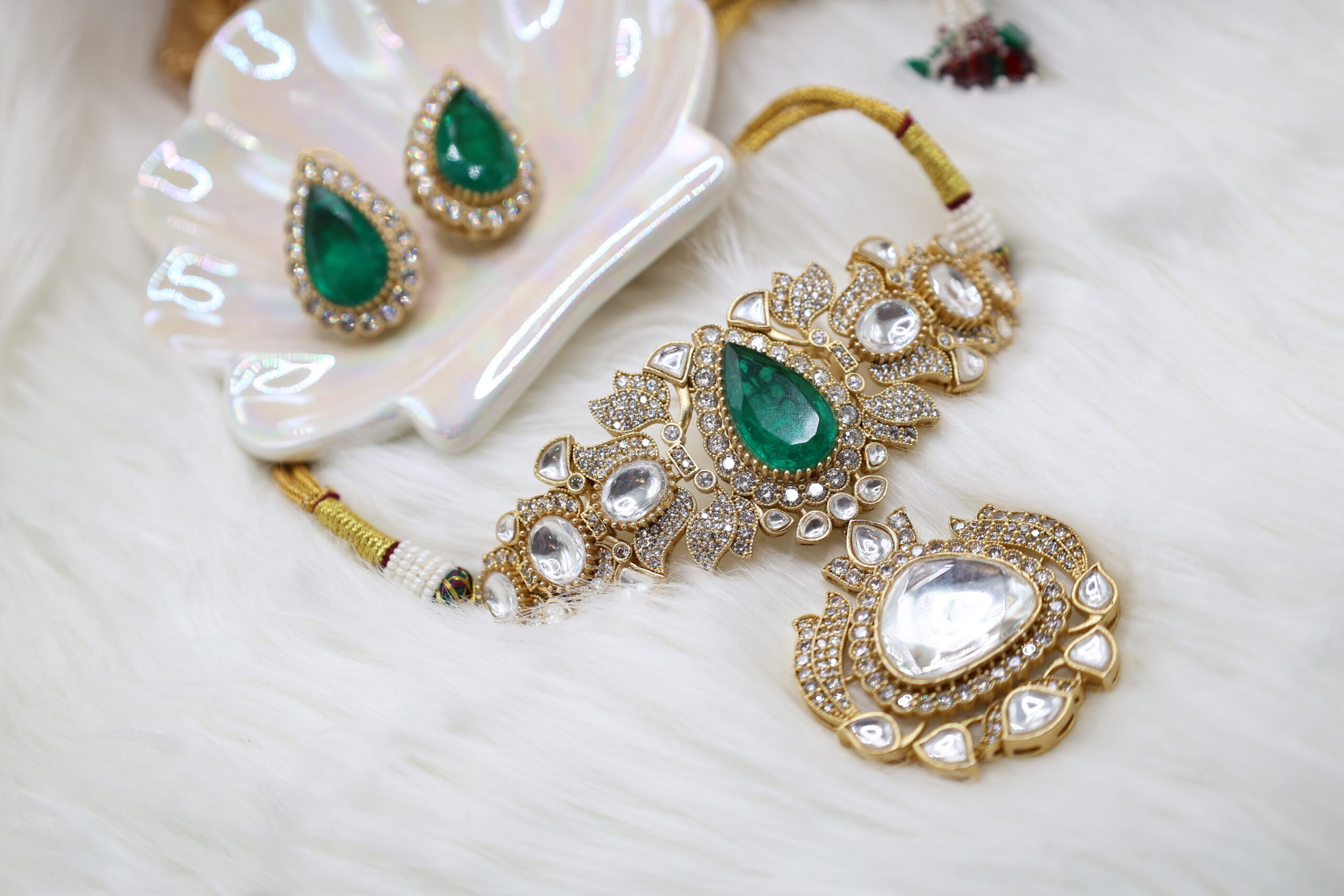 A luxurious fusion of traditional kundan and rich green stones, this set radiates timeless elegance. The captivating design is perfect for festive and bridal occasions, ensuring all eyes remain on you.