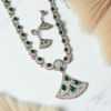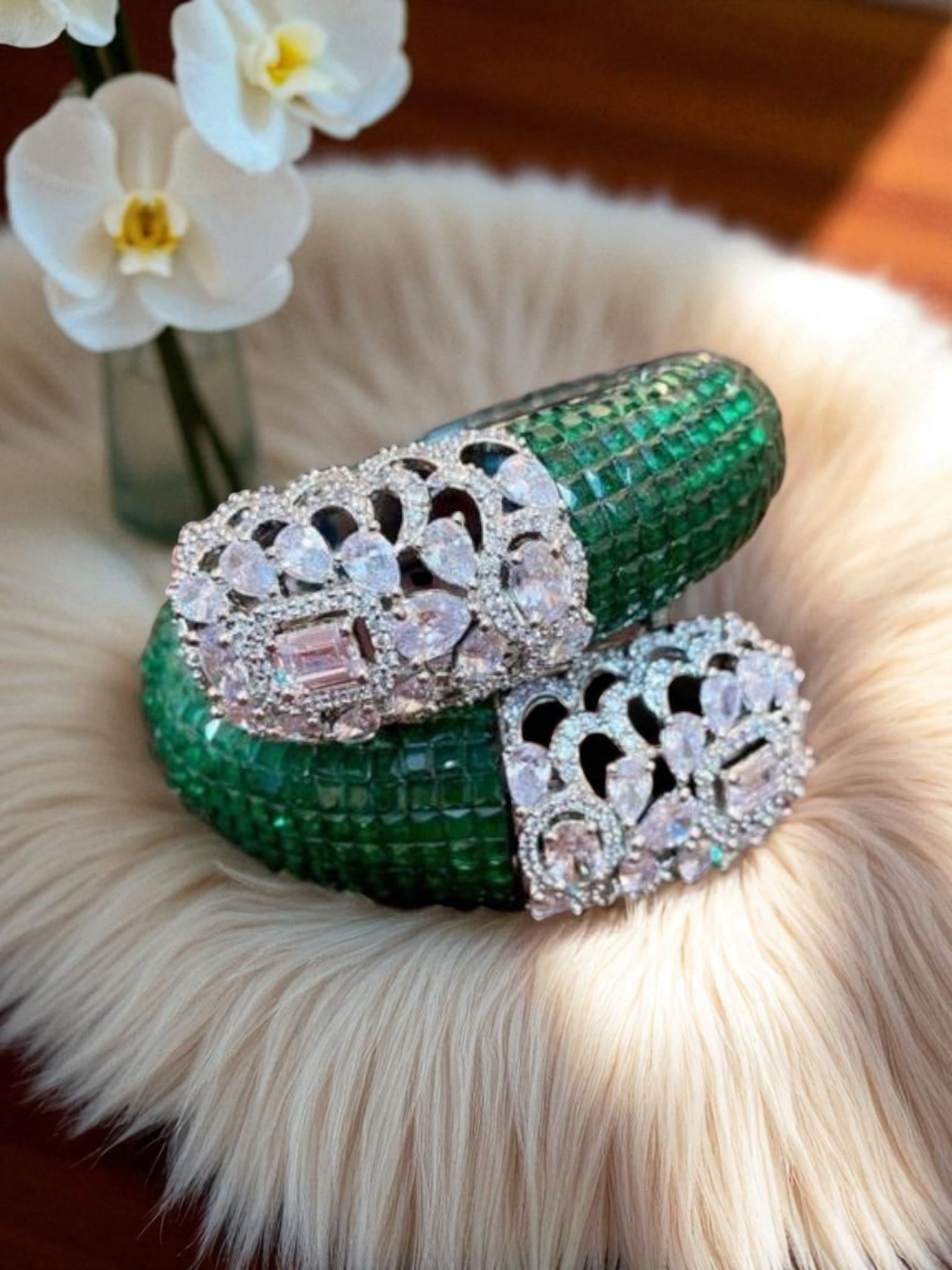 This beautifully structured bracelet combines emerald green and  hues with a sparkling crown of diamond-like embellishments. It’s a sophisticated piece designed for the modern woman who values timeless style.