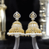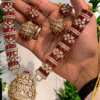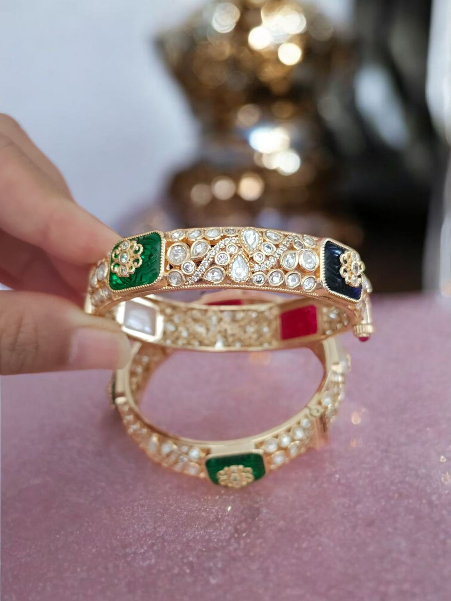 These gold-toned bangles adorned with green, red, and blue gemstones are a fusion of traditional charm and modern flair. Their intricate design and radiant sparkle make them a perfect statement piece for festive occasions.