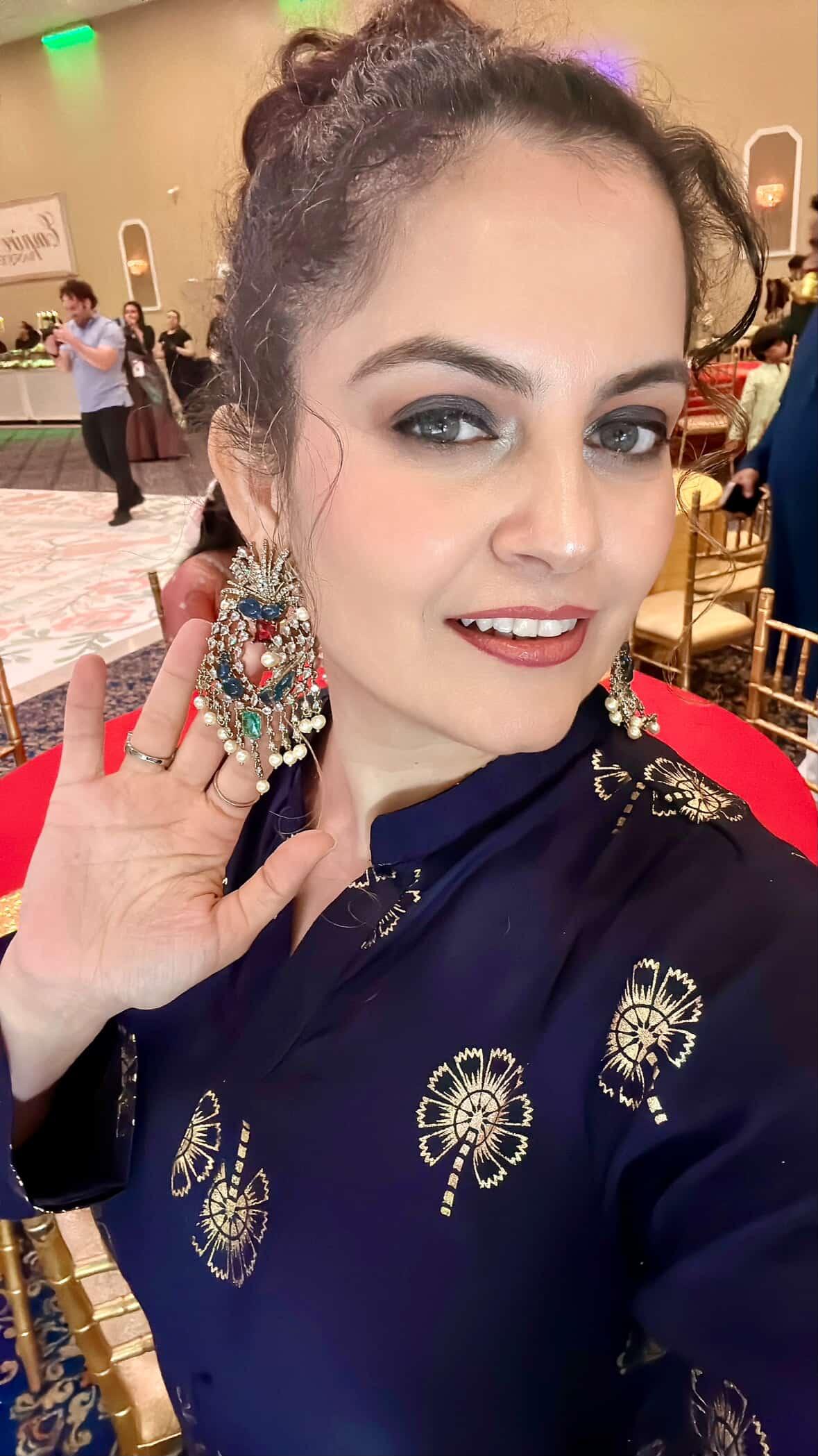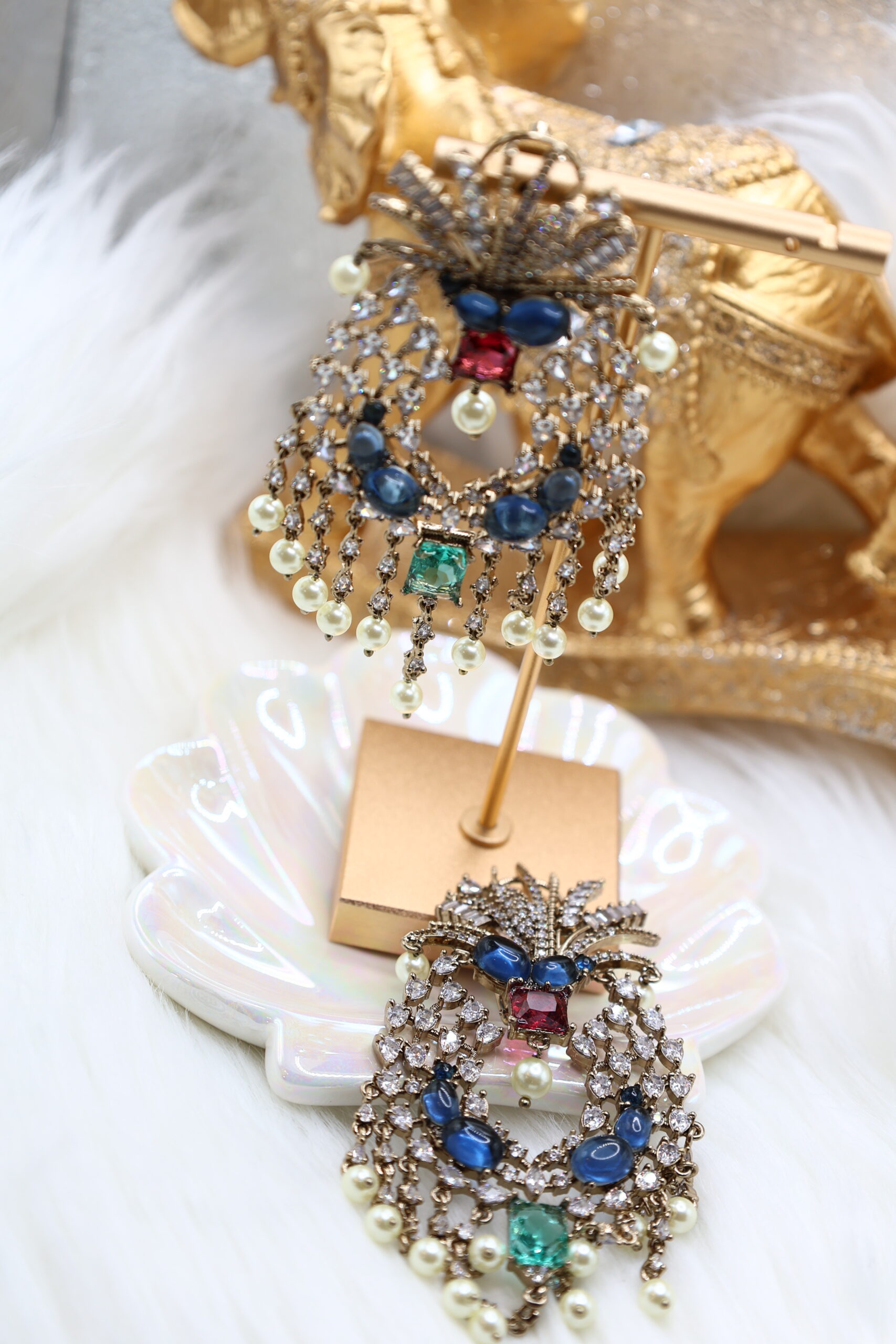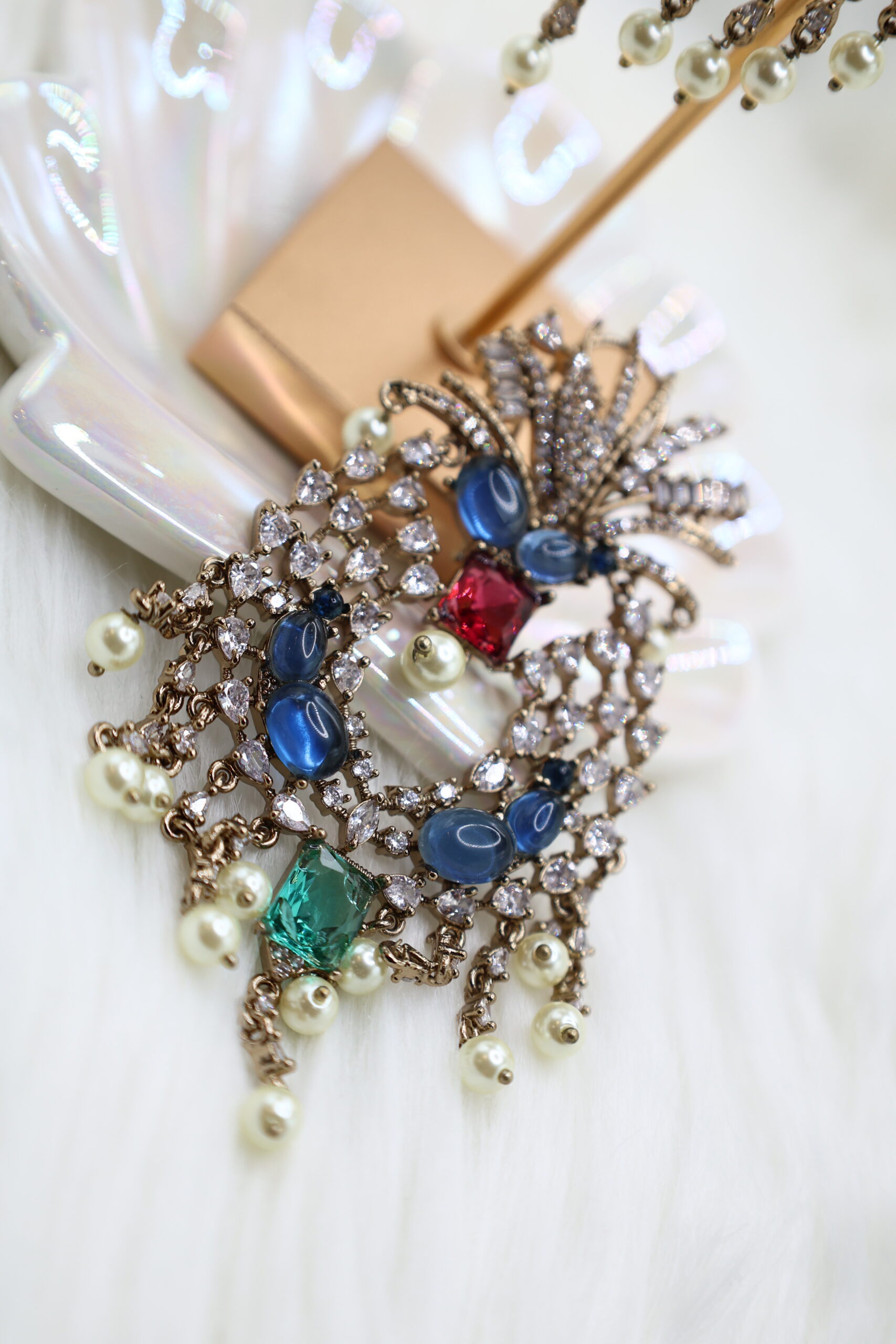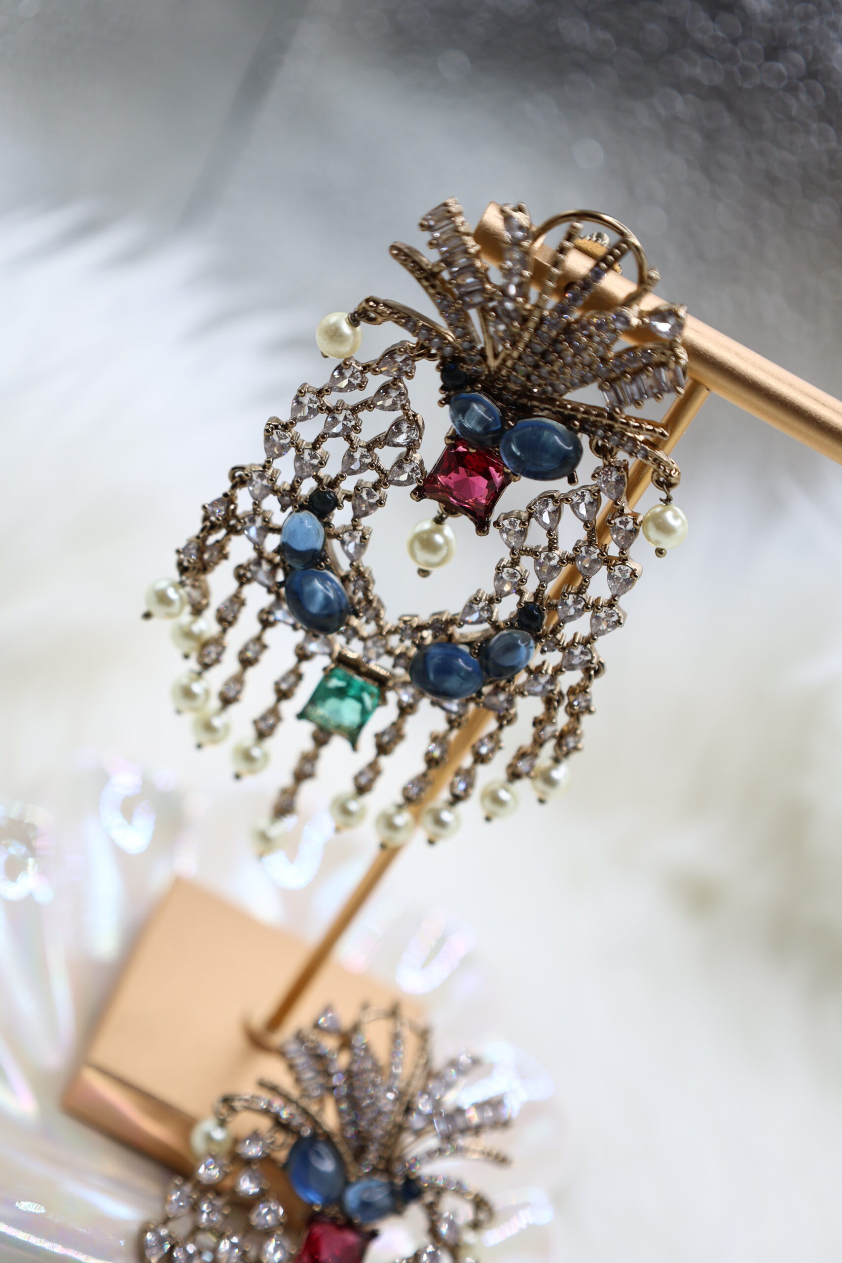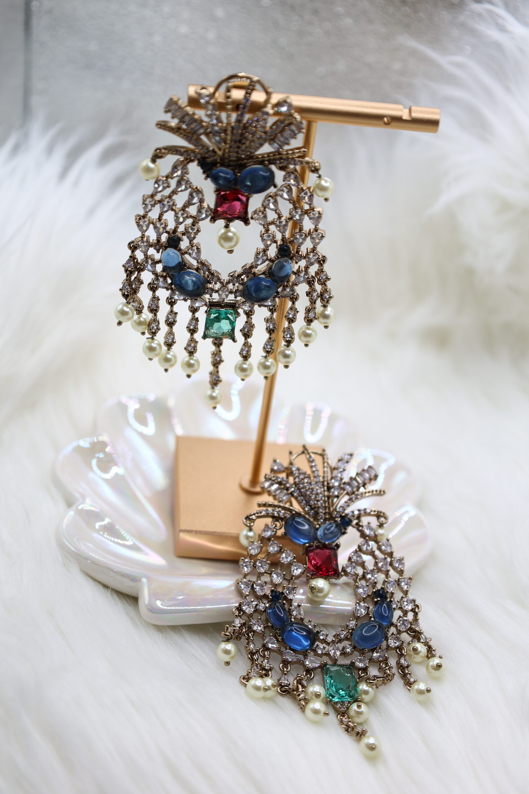 Radiate timeless elegance with these exquisite chandelier earrings, adorned with shimmering diamonds, deep blue sapphires, a striking red ruby, and a vibrant green emerald. The cascading pearl drops and intricate gold detailing add a touch of royal charm, blending traditional artistry with a modern, eye-catching design perfect for any special occasion.