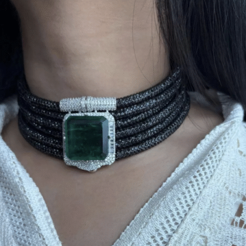 A blend of grace and power, this black and silver floral set features hand-carved motifs that rest gracefully against the skin. The contrast of textures creates a bold, elegant finish—perfect for evening glamour.