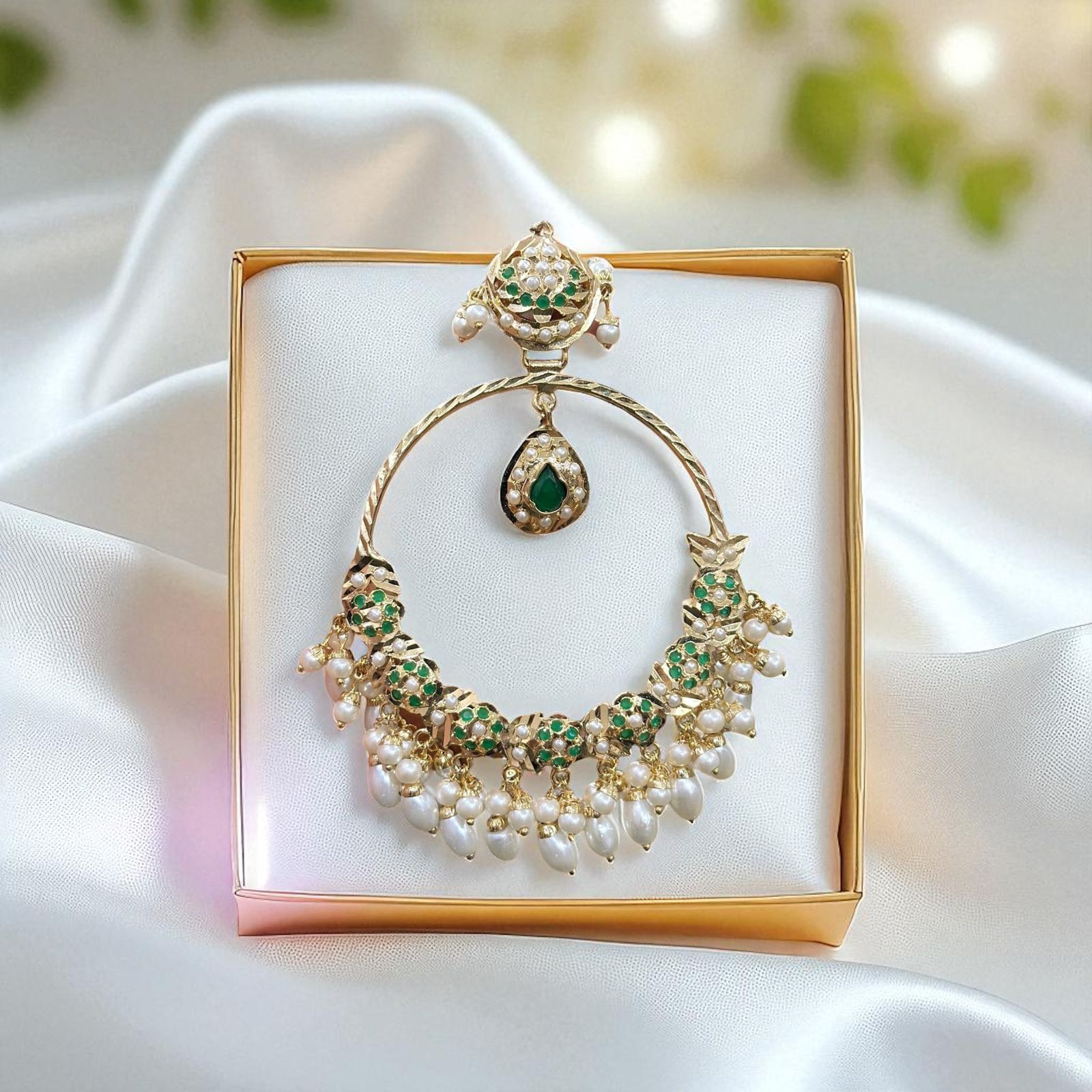 An enchanting chandbali adorned with emerald accents and pearl drops. This regal piece radiates elegance and is perfect for brides or festive wear.