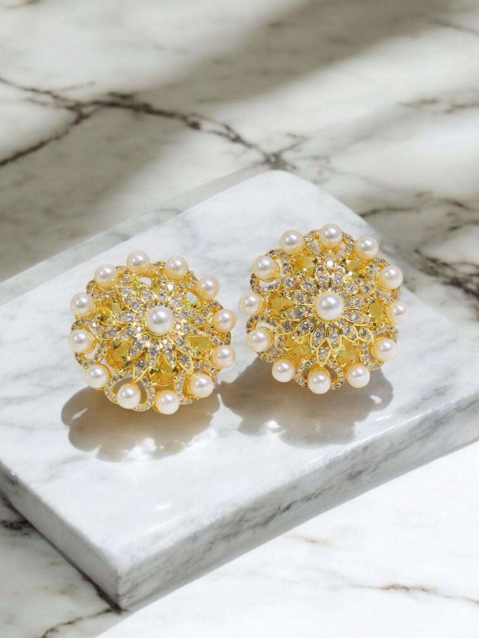 Classic round studs adorned with pearls and sparkling crystals, radiating timeless charm. Elegant yet versatile, they are a must-have for both casual and festive wear.