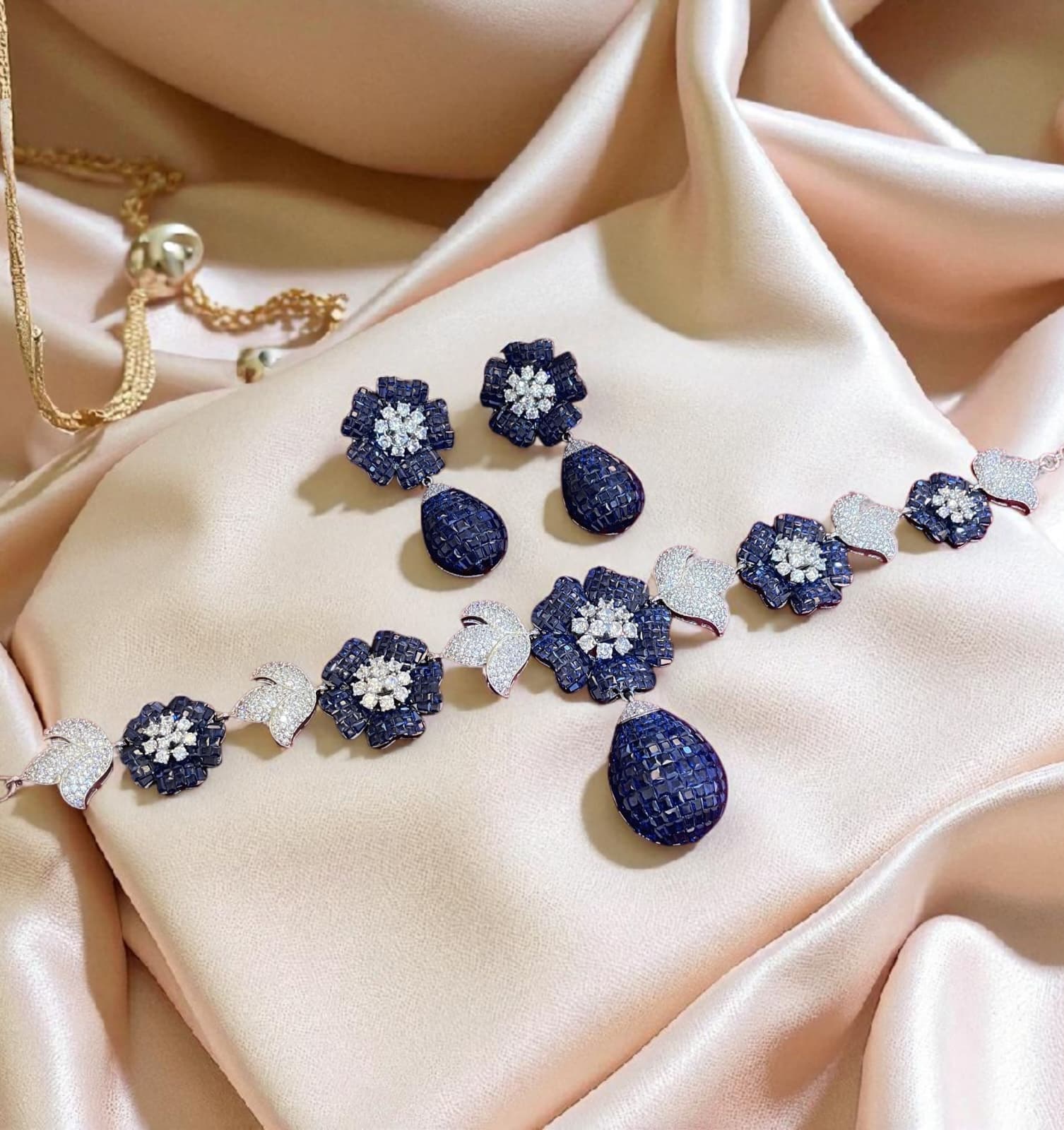 The floral detailing with sparkling diamonds reflects delicate artistry.