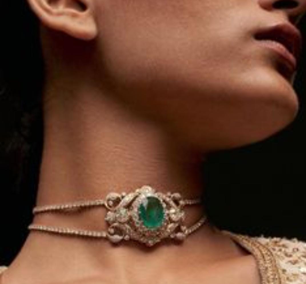 A striking emerald choker embraced with diamond accents, creating a royal yet modern look. Its rich green centerpiece symbolizes luxury and refinement.