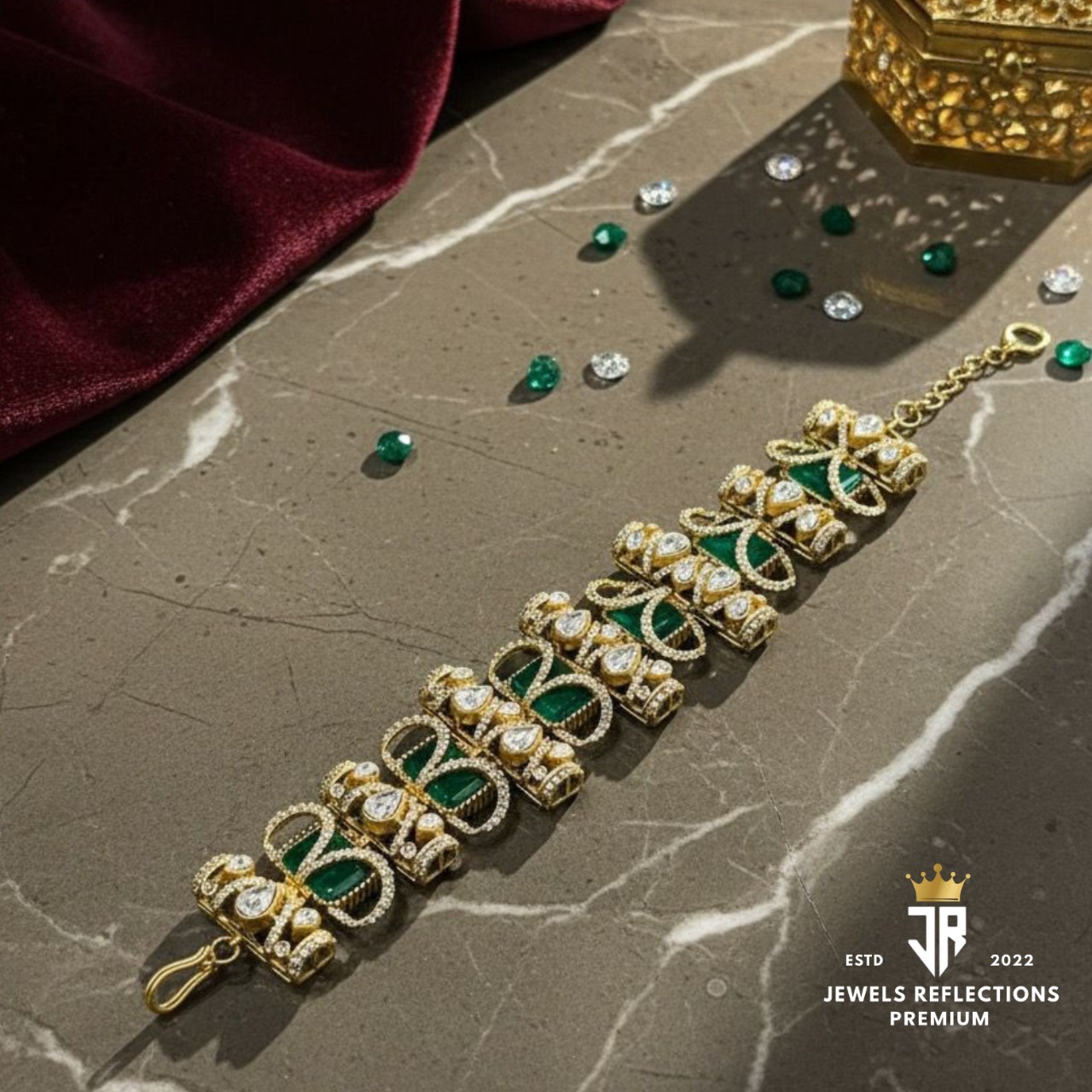 A handcrafted gold-finish bracelet embedded with deep emerald stones.