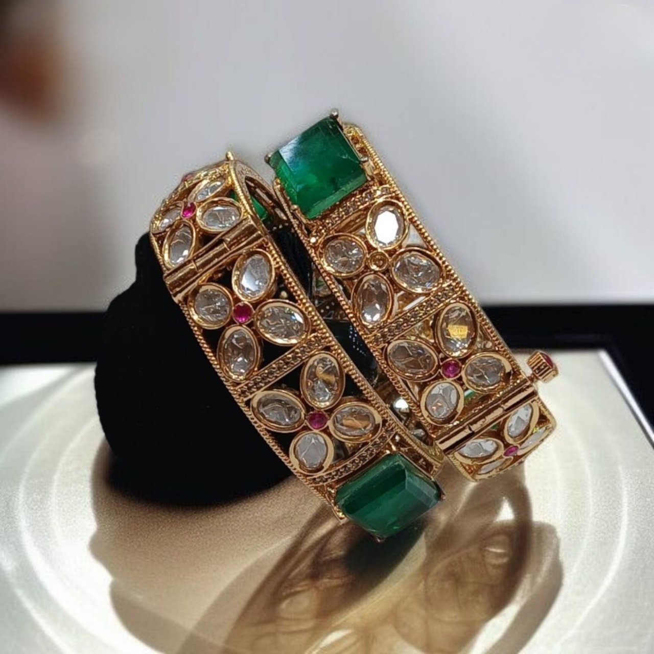 A breathtaking pair of handcrafted Kundan Polki bangles featuring a bold emerald centerpiece, intricate floral motifs, and ruby accents. Perfect for brides and festive occasions, these bangles showcase unmatched luxury and traditional artistry.
