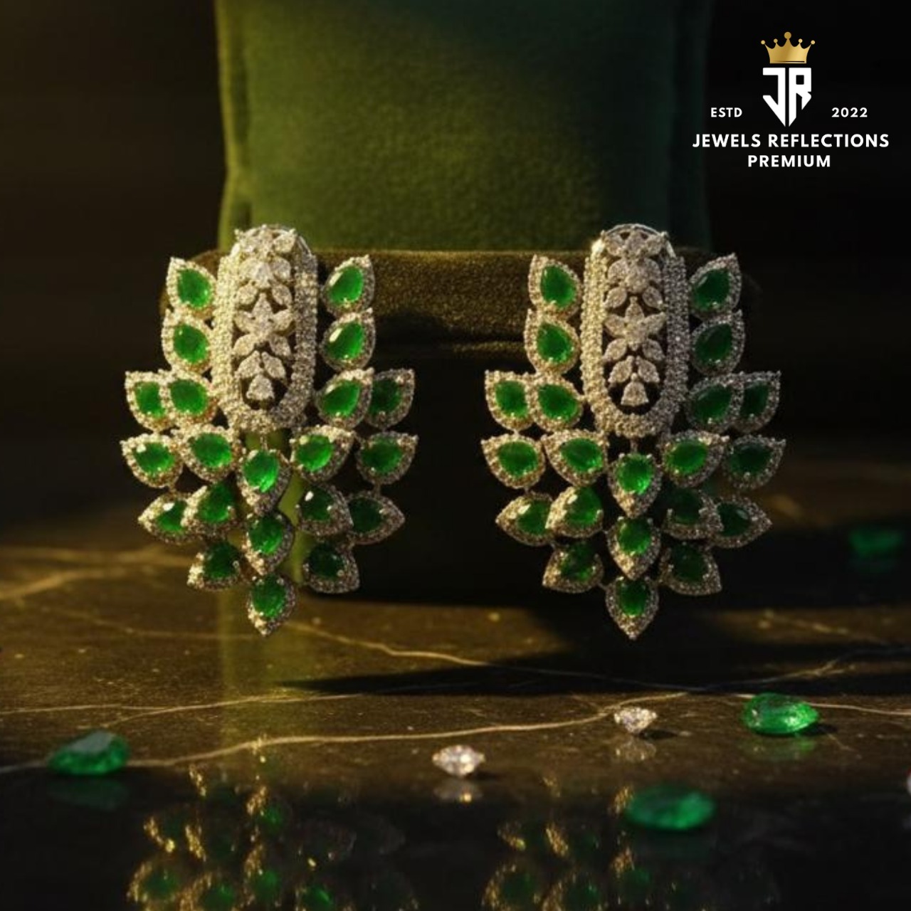 Step into pure elegance with the Emerald Royale Cluster Drop Earrings from Jewels Reflections Premium. Designed for women who appreciate bold luxury and refined craftsmanship, these earrings combine intricate design with dazzling brilliance.