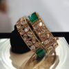 A luxurious emerald-green designer bangle highlighted with intricate floral motifs, CZ diamond detailing, and filigree gold craftsmanship. A stunning choice for weddings, parties, and festive occasions.