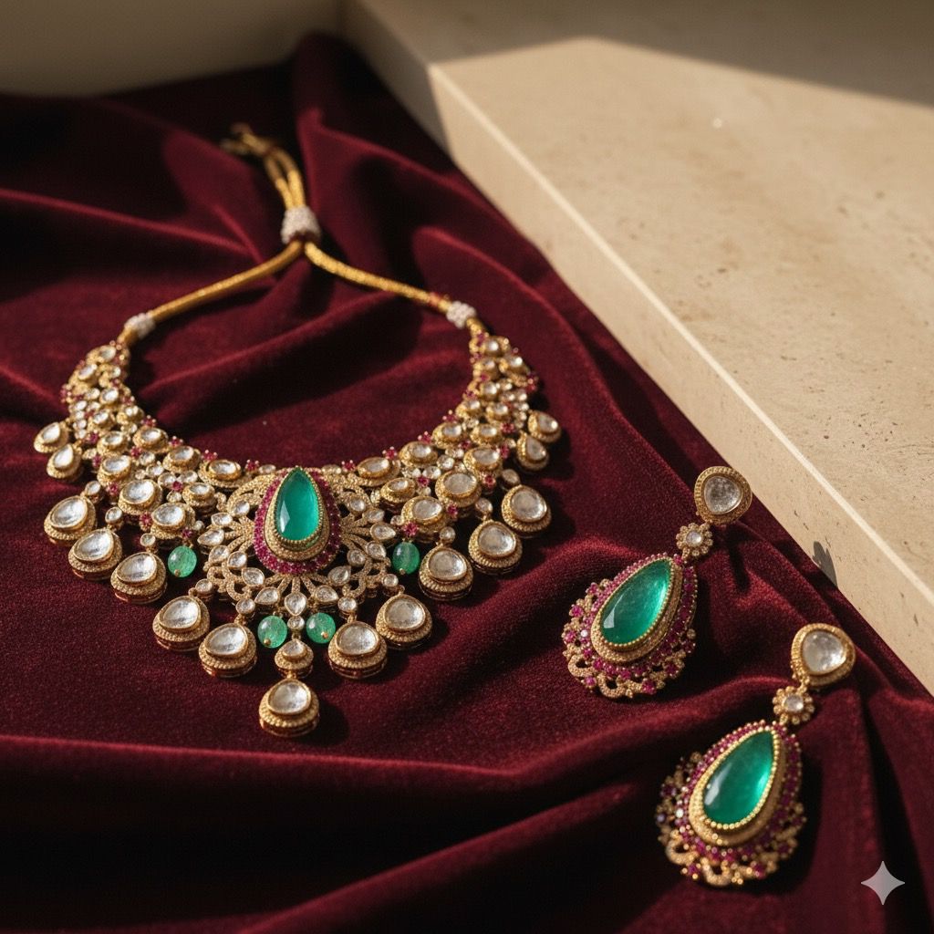 A heritage necklace featuring ethereal temple-style craftsmanship.