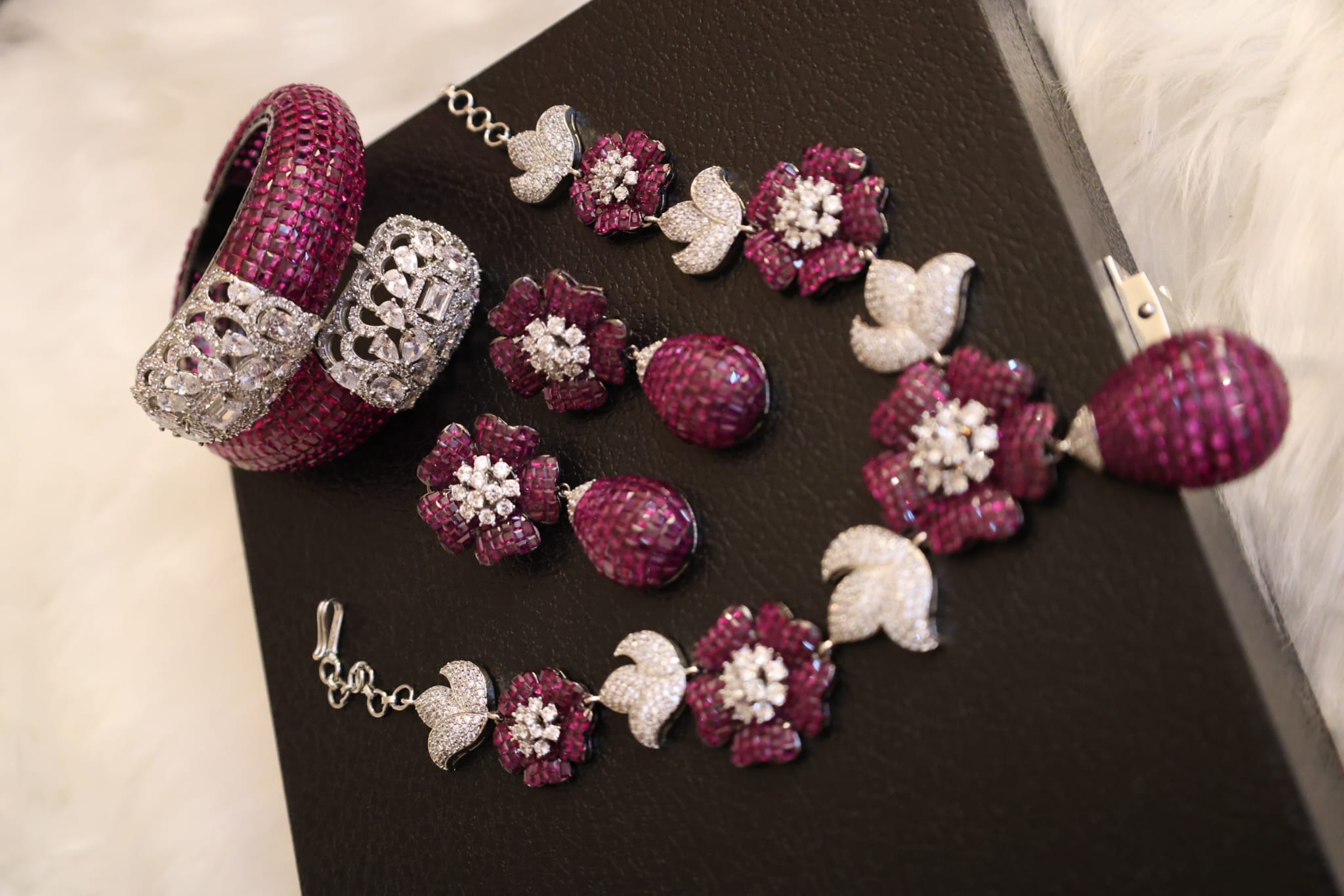 A captivating design featuring purple floral motifs adorned with sparkling accents, this necklace set is a true masterpiece of modern jewelry art. Its vibrant hues and delicate detailing bring a fresh, elegant charm, making it a p