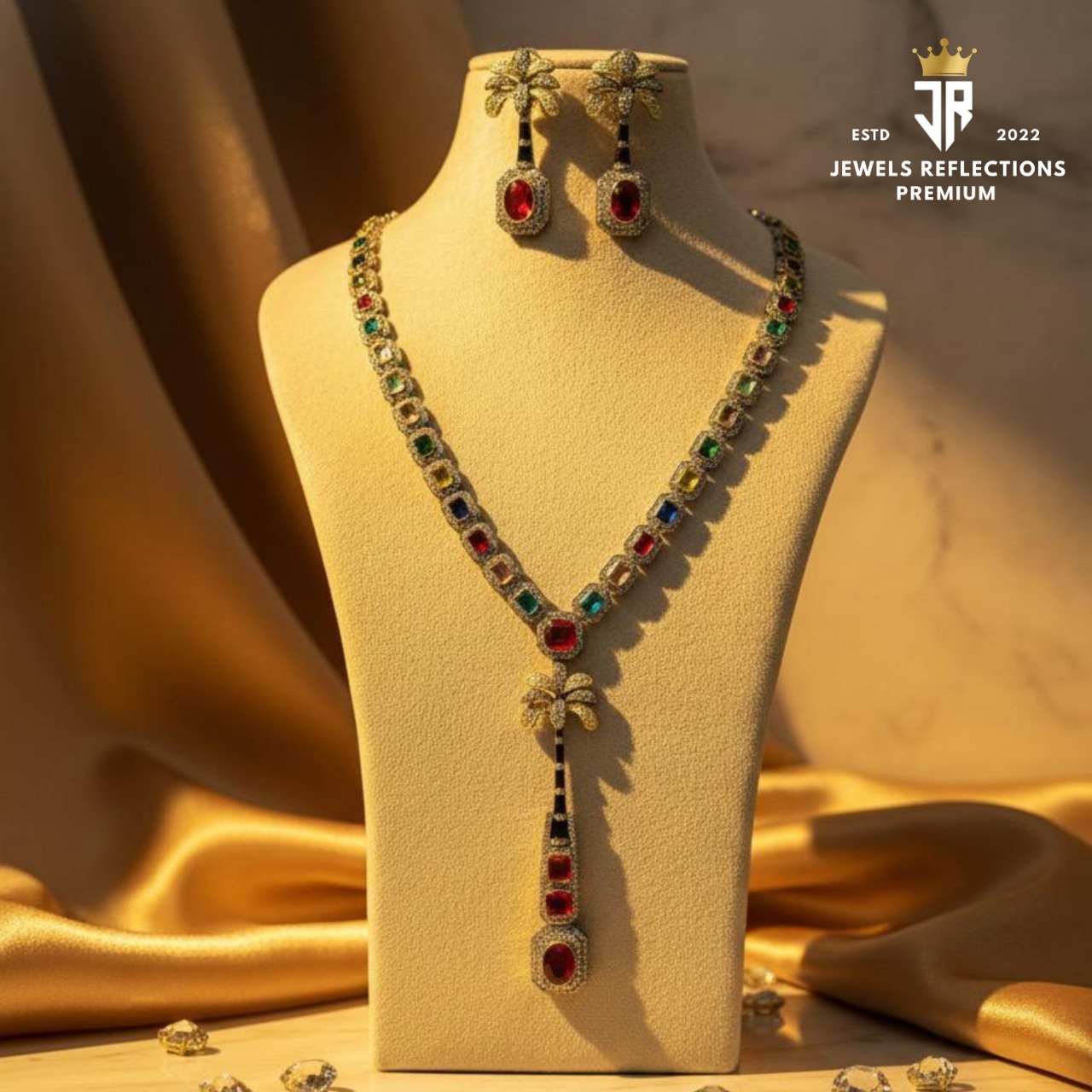 Unveil bold glamour and artistic elegance with the Majestic Multicolour Palm Drop Necklace Set from Jewels Reflections Premium. This exquisite jewellery piece is a blend of vibrant gemstones, intricate craftsmanship, and modern luxury—crafted for women who love statement-making designs.