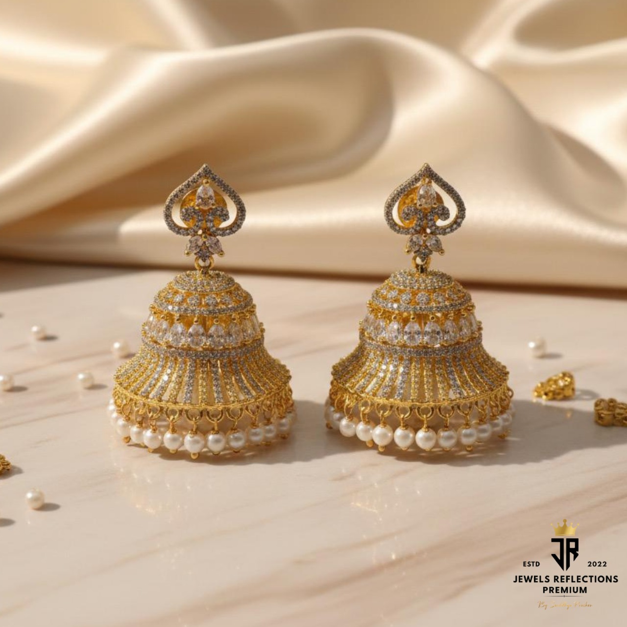 Elevate your traditional elegance with the Majestic Pearl Droplet Jhumka Earrings from Jewels Reflections Premium. These jhumkas beautifully capture the essence of royal Indian jewellery with a blend of modern sparkle and timeless charm.