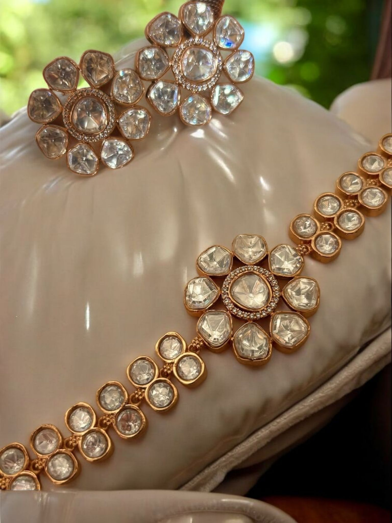 Featuring bold motifs, kundan stones, and matching earrings, this set offers bridal luxury at its best. It’s a masterpiece of elegance and royal charm.