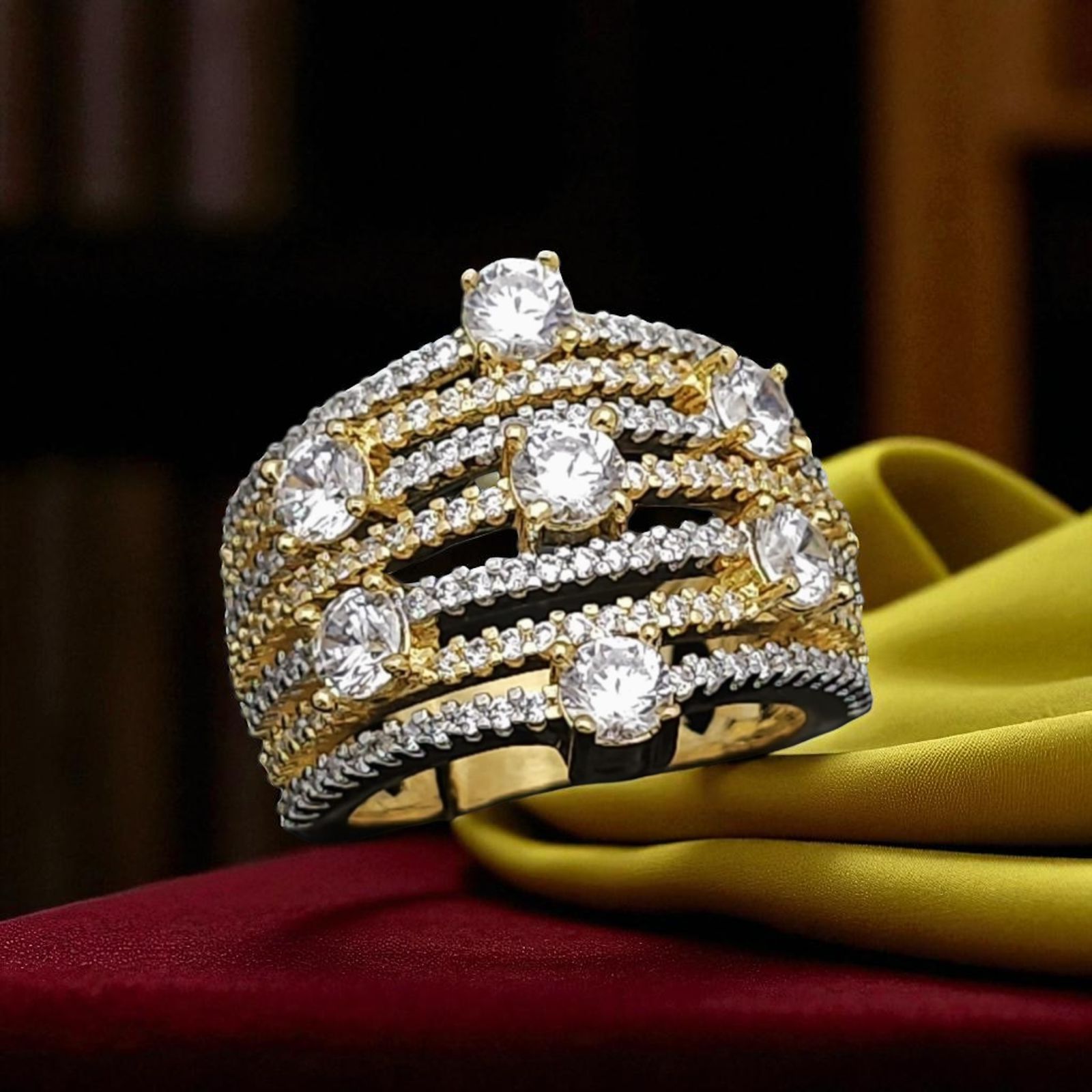 This is a striking double-finger designer ring with a luxurious gold-white finish. Adorned with shimmering stones arranged in a floral and geometric blend, it creates a bold yet elegant statement. The adjustable feature ensures a perfect fit for every hand.