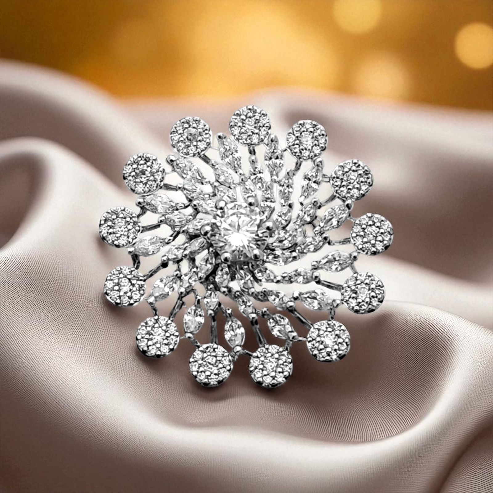 This is a striking double-finger designer ring with a luxurious gold-white finish. Adorned with shimmering stones arranged in a floral and geometric blend, it creates a bold yet elegant statement. The adjustable feature ensures a perfect fit for every hand.