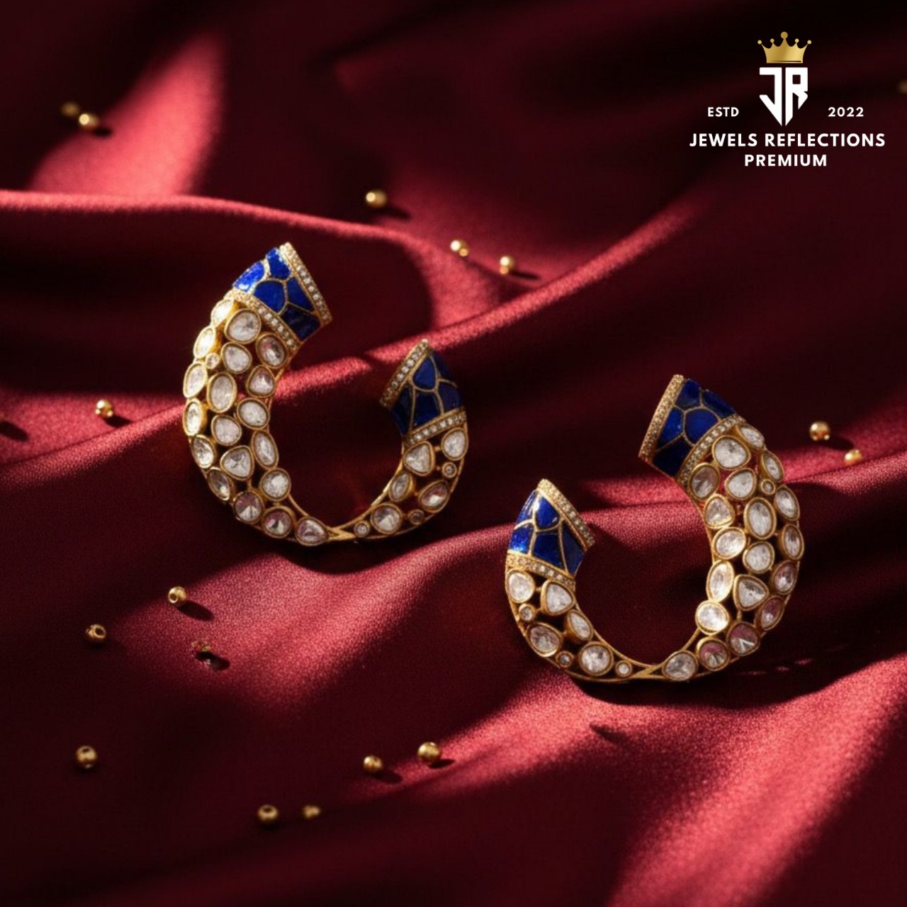 Experience timeless elegance with these Royal Blue Kundan Crescent Earrings from Jewels Reflections Premium. Crafted with exceptional attention to detail, these earrings feature a unique crescent silhouette that blends traditional craftsmanship with contemporary charm.